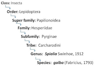 The Indian Skipper Spialia galba (Fabricius, 1793), is a small Skipper (Hesperid) butterfly species found in South Asia and South-East Asia. In sunny days, the butterfly is found flying close to the ground and seen basking with the wings partly open; FW is partly closed and HW is held fully open. Its wings are close while resting and remain hanging on grass blades and the tips of the branches of herbs (Haribal, 1992). It has a swift, twisting but usually short flight.